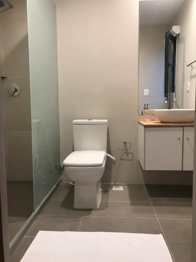 Cocina con taburete, armario, baño completo con ducha, espacio integrado.
